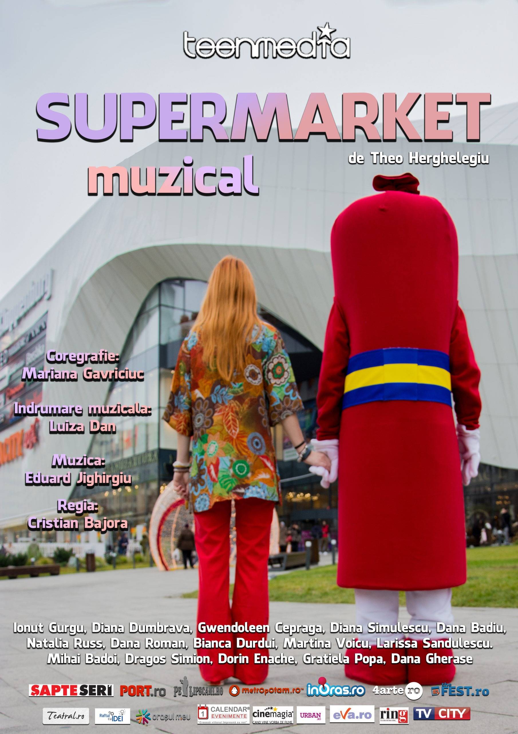 TeenMedia Academy, una dintre cele mai performante școli particulare de teatru dedicată oamenilor obișnuiți, va sărbători șapte ani de existență printr-o producție impresionantă din toate punctele de vedere. Spectacolul aniversar urmează rețeta succesului din showbusiness-ul occidental: jingle-urile, tema și povestea sunt exact ca în musical-urile americane, însă adaptate pe realitățile românești, marcate de consumul post-comunist abuziv. SUPERMARKET este o adevărată revelație în domeniu, fiind realizat integral cu oameni obișnuiți, care și-au descoperit talentul și pasiunea prin intermediul cursurilor de actorie.